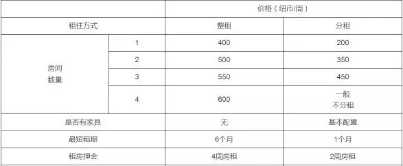 1. 别墅租金(高档住宅区):包家具2房别墅:约$650/周;不包家具2房别墅:约$500/周
